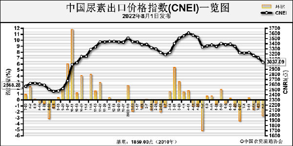 一.國(guó)內(nèi)尿素現(xiàn)貨市場(chǎng)表現(xiàn)1.1國(guó)內(nèi)尿素價(jià)格指數(shù)變化上周(2022年7月25日—7月29日),需求清淡,尿素價(jià)格繼續(xù)下跌。8月1日中國(guó)尿素批發(fā)價(jià)格指數(shù)(CNPI)為2597.60點(diǎn),環(huán)比下跌86.62點(diǎn),跌幅為3.23%;同比下跌193.33點(diǎn)...